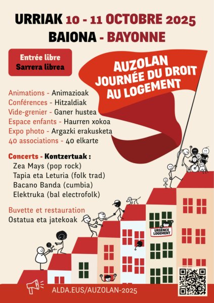 Le vendredi 10 au soir et le samedi 11 octobre 2025, à Bayonne (Place Patxa et rues adjacentes) , Alda vous donne rendez-vous pour la 2ème édition d’Auzolan – La journée du droit au logement. Conférences, repas populaire, animations culturelles, concerts… et plein d’autres surprises ! Entrée libre.