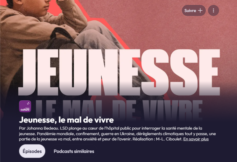 "LSD (La Série Documentaire) plonge au cœur de l’hôpital public pour interroger la santé mentale de la jeunesse. Pandémie mondiale, confinement, guerre en Ukraine, dérèglements climatiques tout y passe, une partie de la jeunesse va mal, entre anxiété et peur de l’avenir."