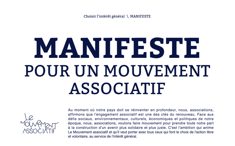"Au moment où notre pays doit se réinventer en profondeur, nous, associations, affirmons que l’engagement associatif est une des clés du renouveau. Face aux défis sociaux, environnementaux, culturels, économiques et politiques de notre époque, nous, associations, voulons faire mouvement pour prendre toute notre part à la construction d’un avenir plus solidaire et plus juste. C’est l’ambition qui anime Le Mouvement associatif et qu’il veut porter avec tous ceux qui font le choix de l’action libre et volontaire, au service de l’intérêt général"
